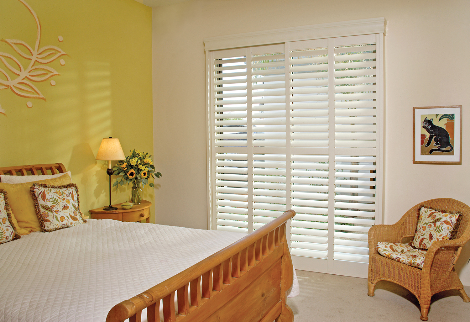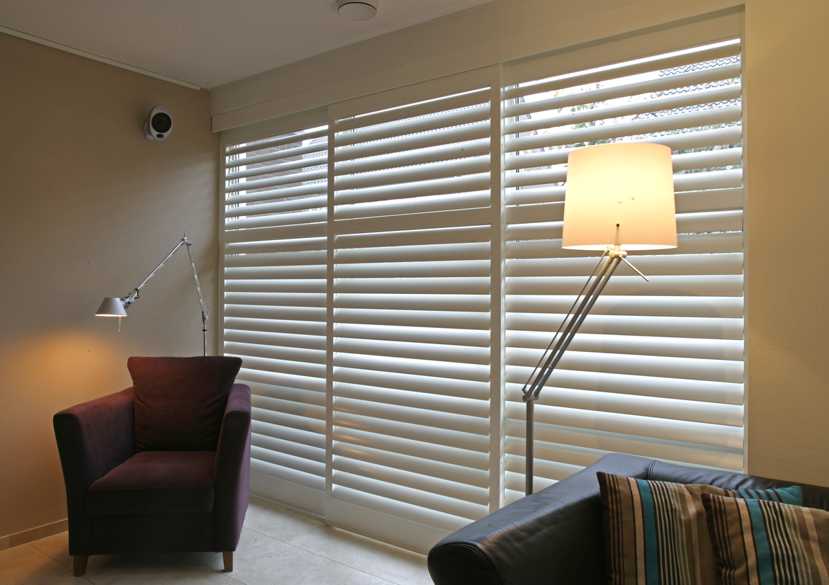 Plantation shutters mounted on a sliding track system, rather than traditional hinges, that glide or fold horizontally to the side to control light and privacy
